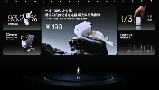 配件方面,一加 100W 小方瓶超级闪充氮化镓充电器磁力集结线套装售价 199 元,这款充电器不仅支持 100W 超级闪充,更具备 65W PD 长期功率输出,小巧精致,能够满足手机和电脑等设备的充电需求。