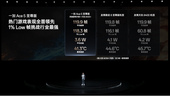 一加 Ace 5 至尊版搭载独家自研的「风驰游戏内核」技术并首次深度注入天玑 9400+ 芯片底层,从源头重构资源调度与功耗管理。在「风驰游戏内核」的加持下,天玑 9400+带来了 8% 的游戏性能提升和 15% 的游戏功耗降低,实现满帧运行、更低温度与更低功耗的全维突破。一加 Ace 5 至尊版可实现《王者荣耀》、《原神》、《崩坏:星穹铁道》在超过 5 小时重载场景下的首个无限满帧运行,表现远超行业平均水平,游戏体验就像“开了挂”。