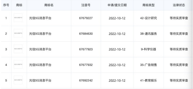 启信宝信息显示,“光信5G消息平台”的商标归属于“北京众盈通信息技术有限公司”。
